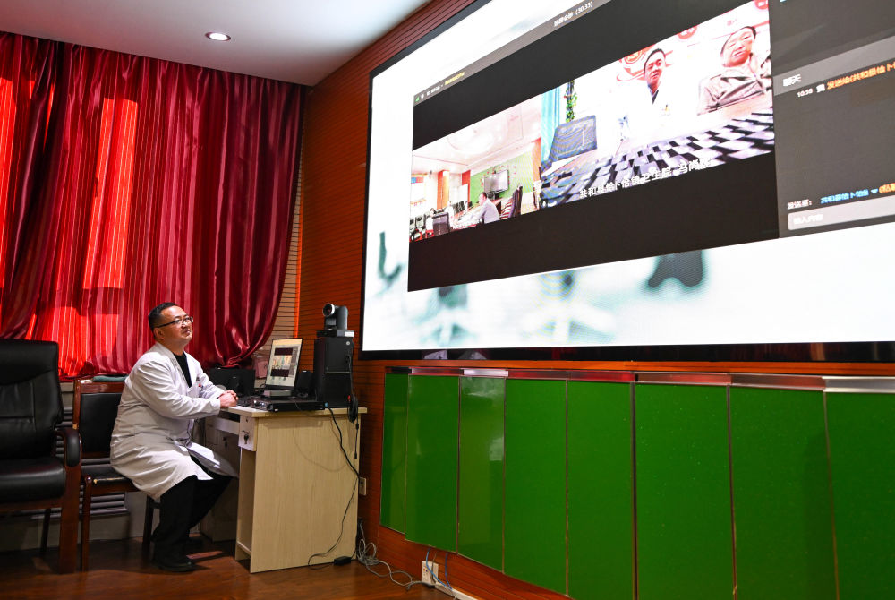 2024年12月17日,,,,,,,在青海省海南藏族自治州共和县中医院,,,,,,,医生与州里卫生院连线举行远程会诊。。。。新华社记者 张龙 摄